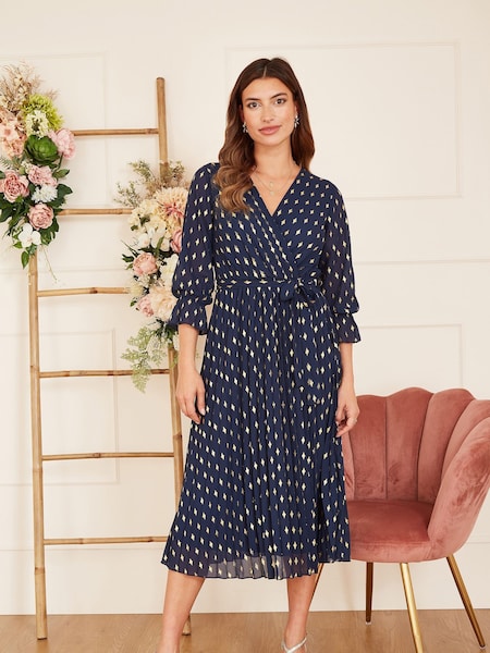 Yumi Teal Blue Foil Printed Pleated Wrap Midi Dress