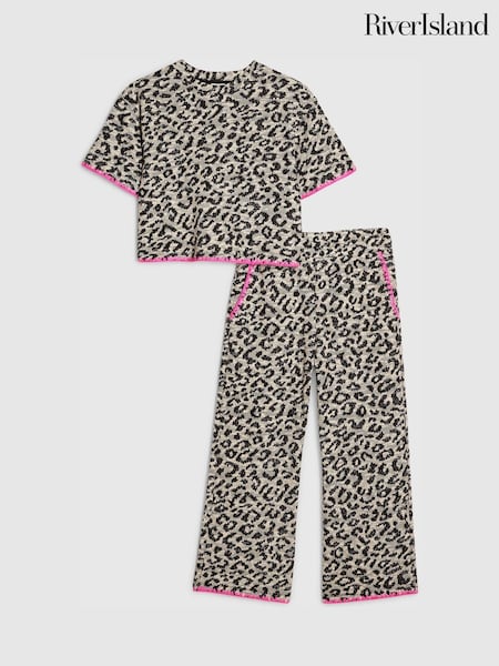 River Island Brown Leopard Whipstitch Cropped Top & Wide Leg Joggers Set