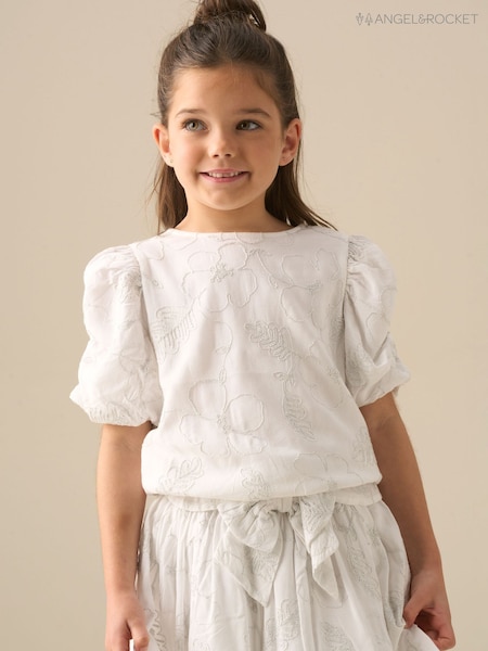 Angel & Rocket White Dalhia Floral Embriodered Tie Waist Puff Sleeve Top