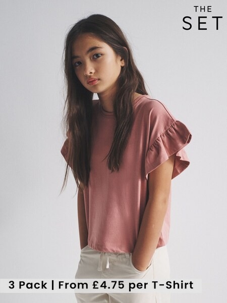 The Set 3 Pack Frill Sleeve Cotton T-Shirts Pink/Brown/Red