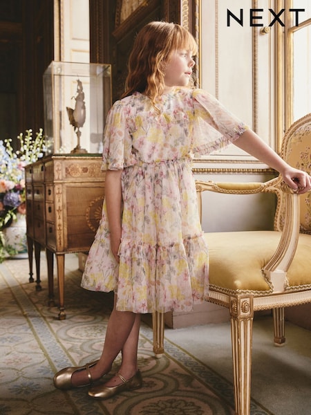 Yellow Floral Angel Sleeve Mesh Occasion Dress (3-16yrs)