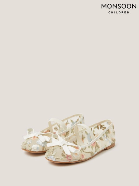 Monsoon Cream Floral Embroidered Mesh Ballet Flats