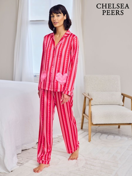 Chelsea Peers Pink Satin Heart Pocket Striped Long Pyjamas Set