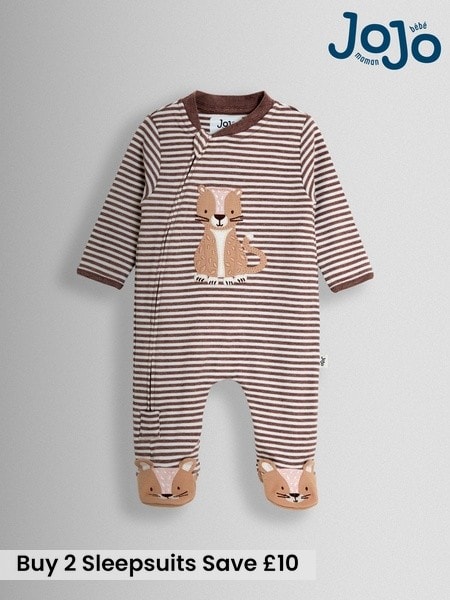 JoJo Maman Bébé Brown 100% Cotton Footed Stripe Appliqué Sleepsuit