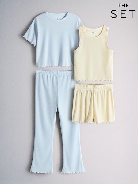 The Set 4 Pack Rib Vest, Shorts, T-Shirt and Flared Legging Nightwear Set Blue/Yellow